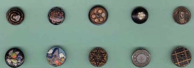 We celebrated the April 2003 opening of the Keep Homestead Museum with a Button Sampler Exhibit featuring examples of Myra’s many different types of buttons. In the main cabinet of the Button Room there were enamels, Golden Age, silver, Aritas, Satsumas, Moonglows, fabric, vegetable ivory, Eskimo art, horn, Jerusalem Pearls, a charm string, ruby glass, black glass, cinnabar, Brooks, celluloids, ivoroids, Bakelites, and others on display.