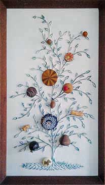 Along with the mosaic buttons, the collection includes Kate Greenaway buttons, Art Nouveau and Gibson Girl buttons, enameled and Gay Nineties buttons, as well as opera, storybook, and other figural buttons manufactured during this time period, to name a small portion of the variety of buttons in the museum’s extensive collection. Many of the buttons are featured in creative mountings.