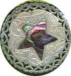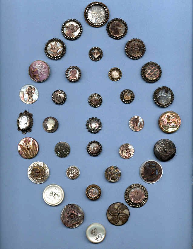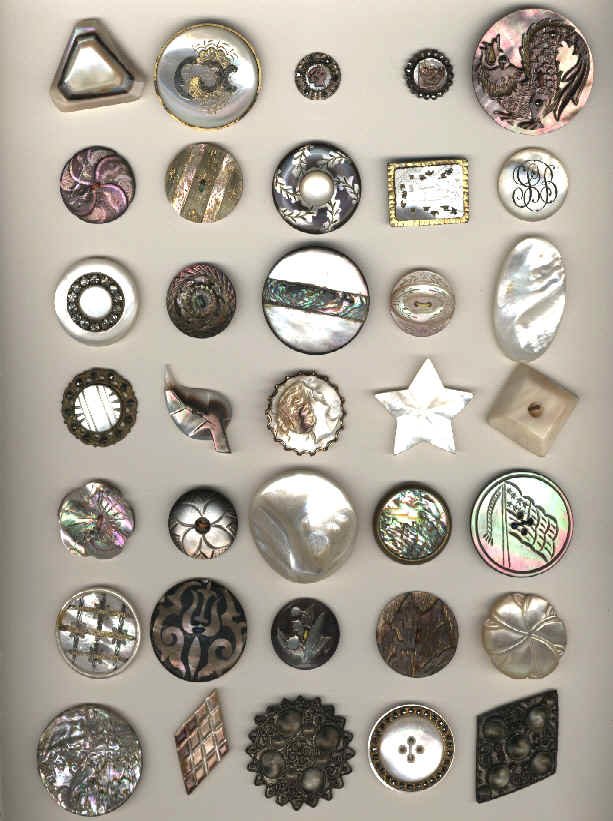 Of special note in the Jerusalem Pearls are two buttons that have abalone inlaid on the face of each button. The shells used to produce these very beautiful buttons are imported to the Holy Land for the artists to carve. Many of these buttons were exported to the United States in the 1950s, and were very popular with button collectors. They are still being carved today in the Holy Land. The earlier buttons are usually more intricate in design and are very desirable when found by collectors.