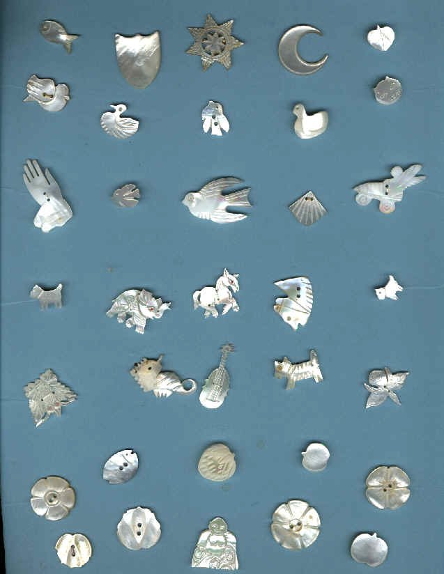 There are several cards of vintage shell buttons. The beautiful dyed and etched buttons, as well as the watch wheel buttons and lovely large carved buttons, are a tribute to the industry and shows us why they were so popular. There are, of course, examples of more modern mother of pearl buttons as well. There is one card just devoted to abalone shaped into fish. There is another card of realistic mother of pearl buttons made by a nearby button factory. In Monson, we are fortunate to have had a button factory right next door to us in Staffordville, Connecticut. You can still visit the old site of the now-closed factory and walk on Button Lane. You may even be fortunate to walk on top of used up shells. If you wish to examine some of the button making items from this factory, visit the Stafford Springs Historical Society. Included in their exhibit are pictures taken inside of the button factory. When most non-collectors think of pearl buttons, they immediately call to mind the buttons that were on their ancestors’ shirts. Today, buttons made from plastic have replaced these mother of pearl buttons. As you examine some of the pictures posted with this article, I think you will agree that mother of pearl buttons can indeed be very decorative as well as utilitarian.